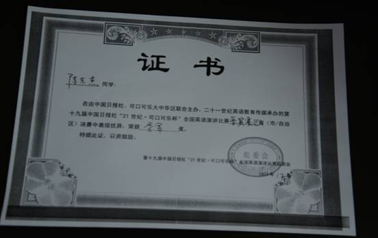 我系陈东杰同学在“21世纪可口可乐杯”全国英语演讲比赛中获得佳绩